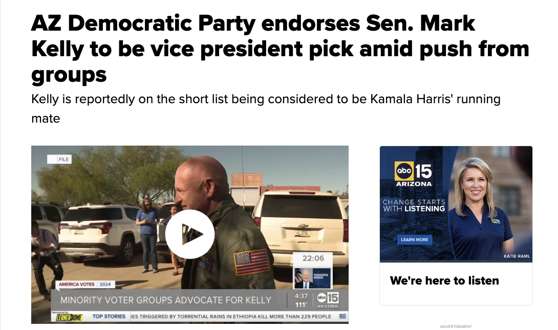 ABC 15: AZ Democratic Party endorses Sen. Mark Kelly to be vice president pick amid push from groups