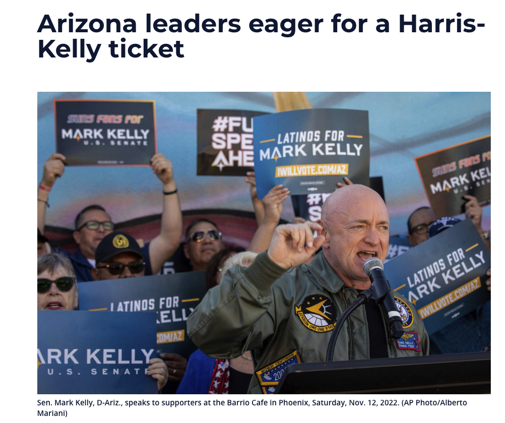 Three major voter outreach groups that previously endorsed both of Kelly’s senate runs announced their support for a Harris-Kelly ticket as well Wednesday. Activate 48, Our Voice Our Vote, and Living United for Change in Arizona (LUCHA) released a joint statement “making the case for why U.S. Senator Mark Kelly would be an exceptional Vice President.”